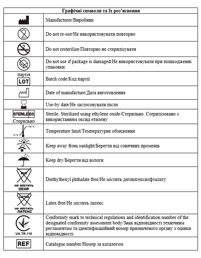 - Виробник не несе відповідальності за будь-які випадкові або наслідкові ускладнення у зв’язку повторним використанням медичного виробу, або використанням його не за призначенням.