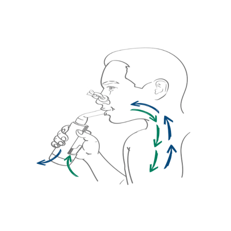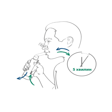 6. Перші 2–3 вдихи пацієнту слід зробити неглибоко, після чого – робити вдихи як зазвичай. Видихи слід робити лише через мундштук всередину приладу, оскільки залишки речовини після видиху затримуються сорбентом у камері деактивації в корпусі приладу.